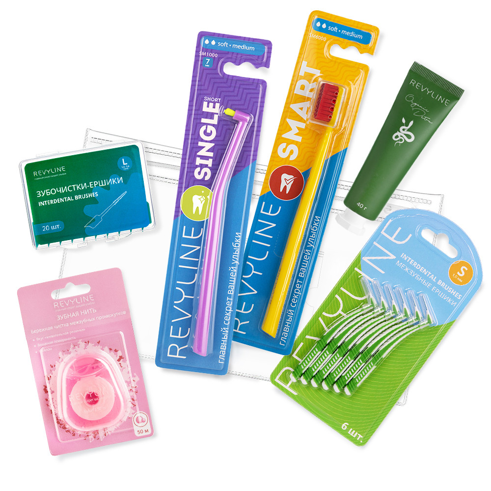 Профилактический набор Revyline – это самые необходимые аксессуары для ухода за полостью рта, дорожный пенал из водоотталкивающей ткани и прозрачная косметичка. Удобно брать с собой в дорогу, обеспечивая качественную гигиену где бы вы ни были.
